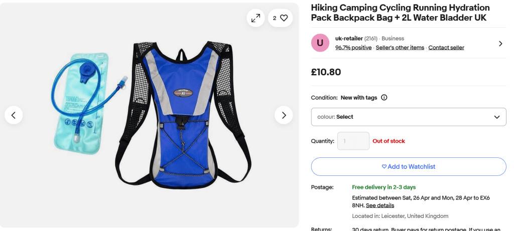 First impressions are good. The bag sits well, without rubbing anywhere and even though I had 2kg of water in it, it wasn’t heavy or cumbersome. It also doesn’t foul my pockets. I might make me a bit sweaty on hot days, but it has a fairly small footprint. On a 2hr test ride I got through about a litre of water without trying. That’s a lot for me – I wouldn’t normally bother taking a bottle on a ride like that. It should be invaluable once I start riding long distance time trials – 2 litres is plenty for a 100 miler.
