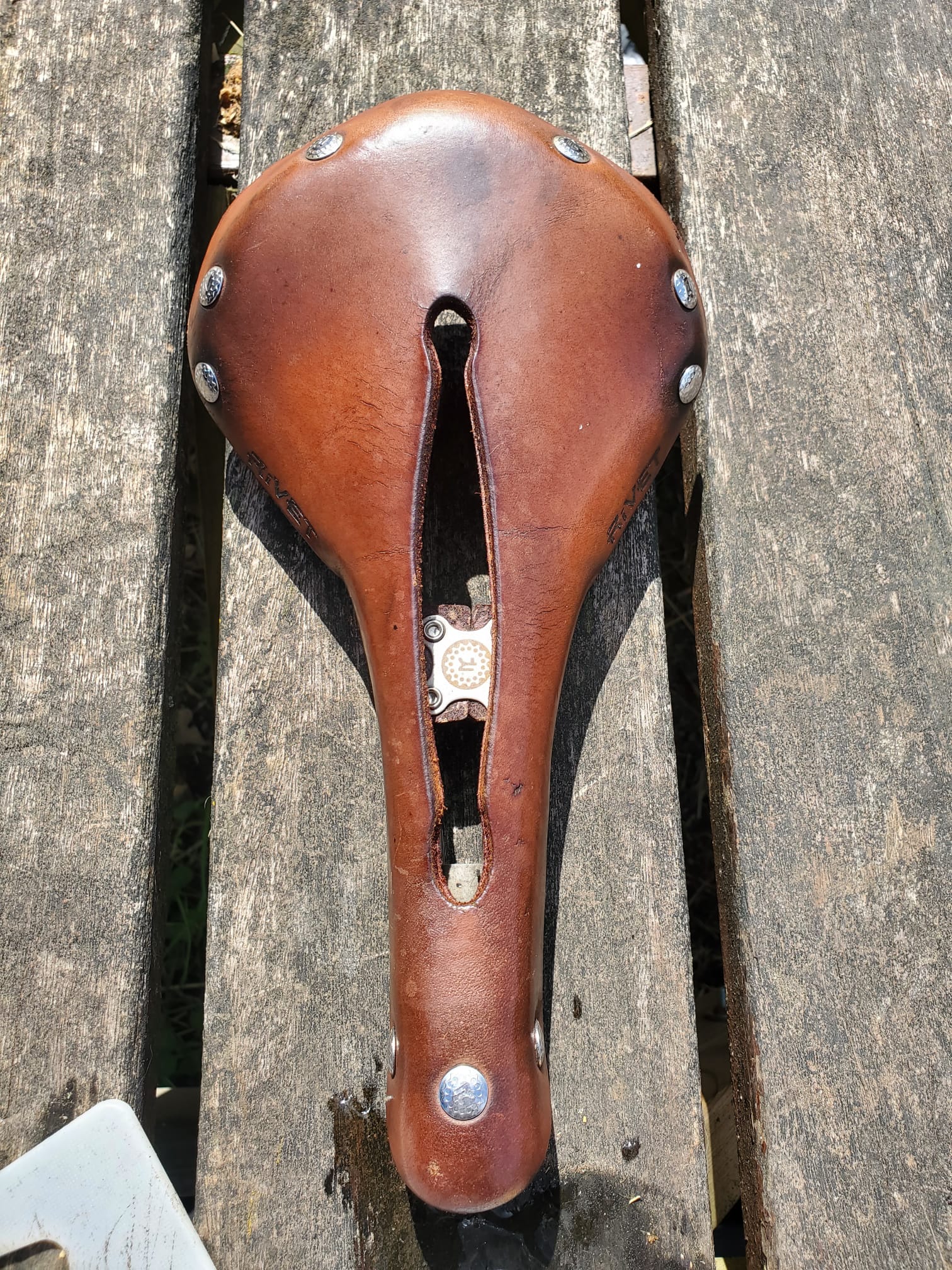Since my beloved Pearl Independence snapped a nose bolt a few weeks ago I’ve been fretting about saddles. That saddle was incredibly comfortable and a comfy saddle is the bedrock of any audaxing set-up. Although I replaced the bolt (and subsequently rode another 500km) the saddle is beyond redemption. It was stretched (the bolt was wound out way too far, which is odd because I don’t like fiddling with saddle tension) the nose was cracked, the leather was dry, the protective underlayer was delaminating and the whole top was twisted, because I’m clearly a lopsided ape with a dominant bollock leg.