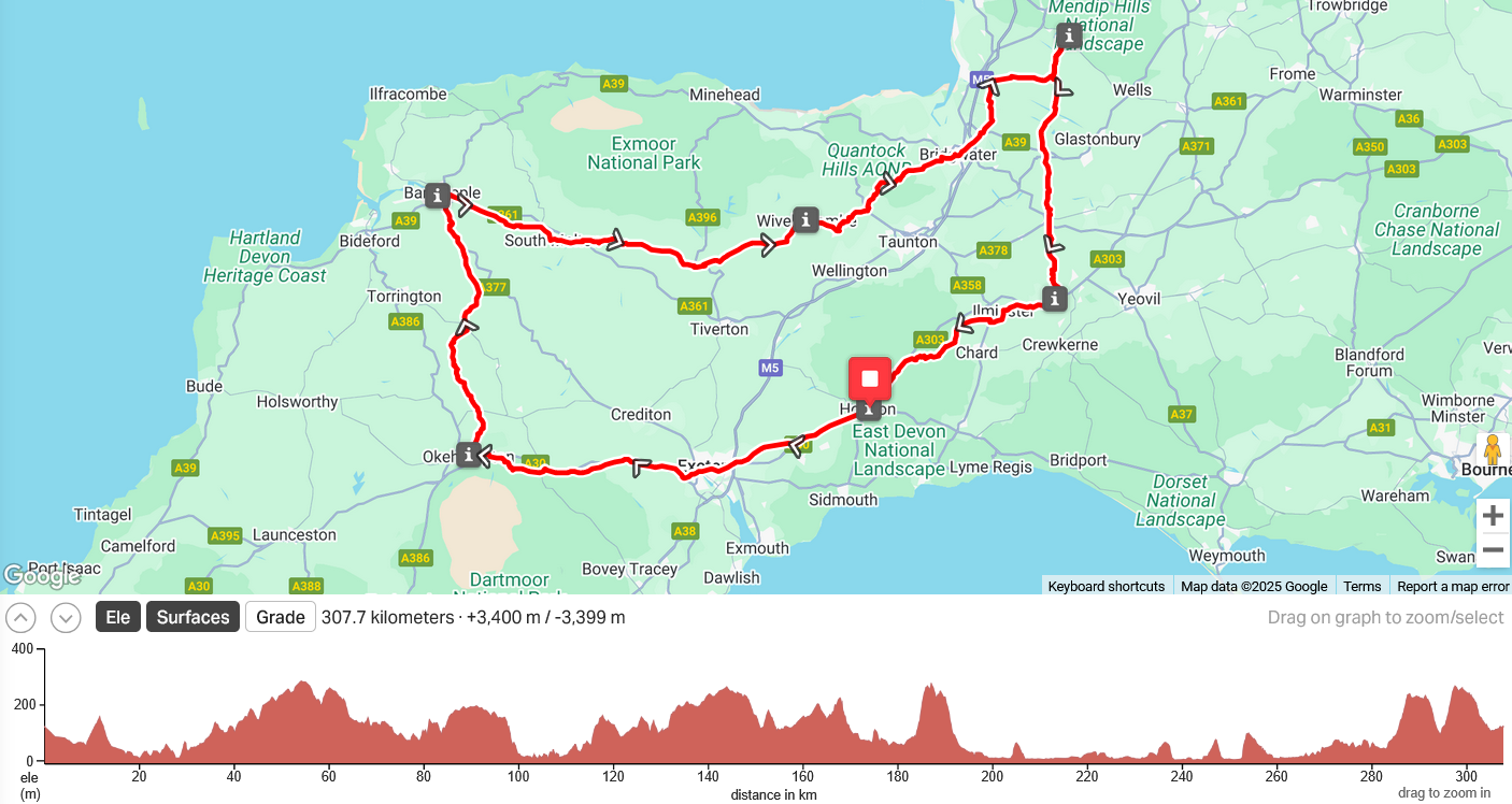 Meanwhile Andy steamed on alone, contending with a fierce headwind from Barnstaple to Cheddar and finishing in an impressive 15hrs 35min (second rider back). Despite struggling on the horrible grind from Okehampton I’m pretty confident that if my pedal hadn’t died I’d have managed to hang on and do my turns on the front. The next ride we’re scheduled to do is the Back to the Smoke 400km, which is much more to my liking, so all being well it should be a fast one.