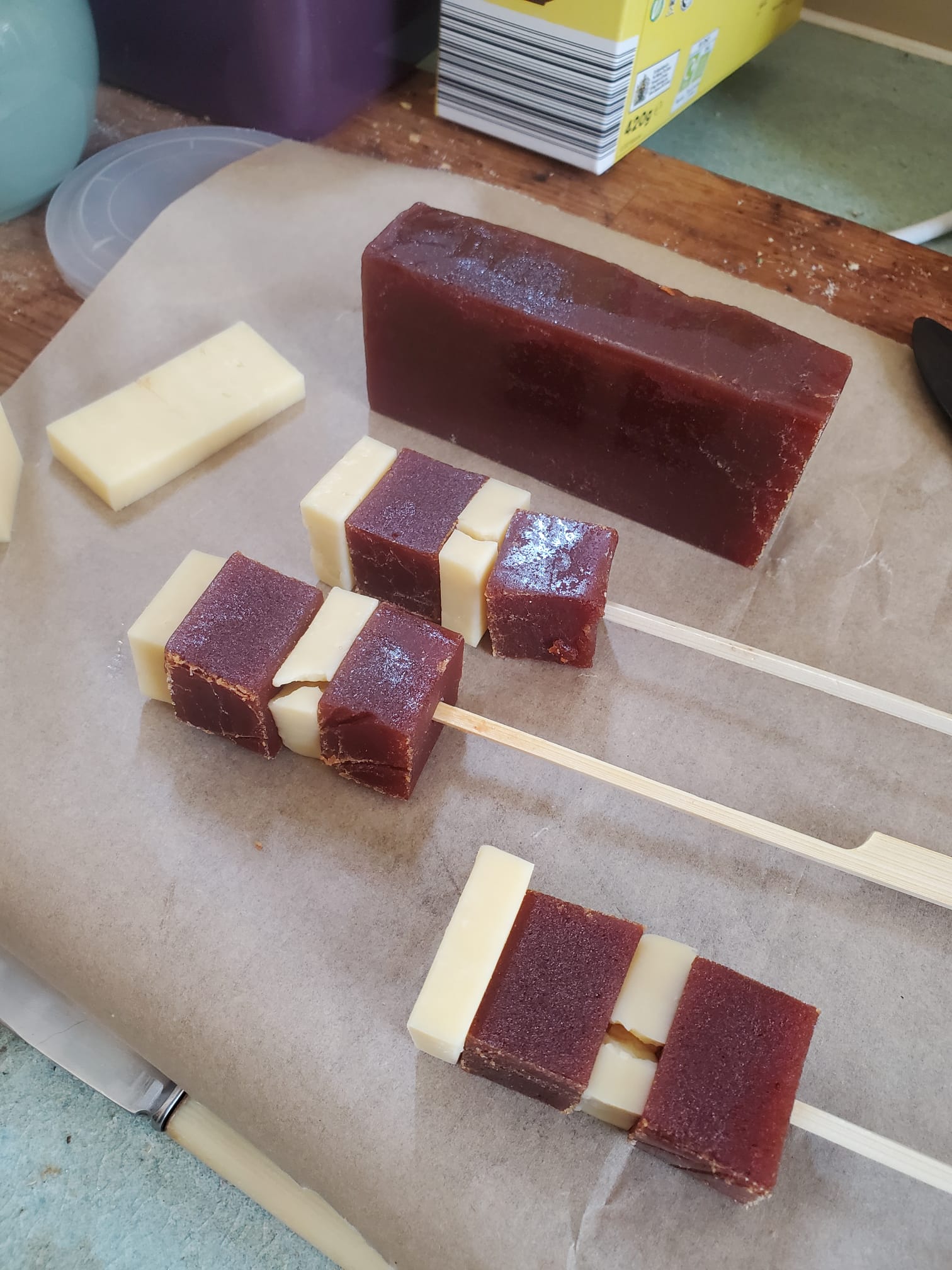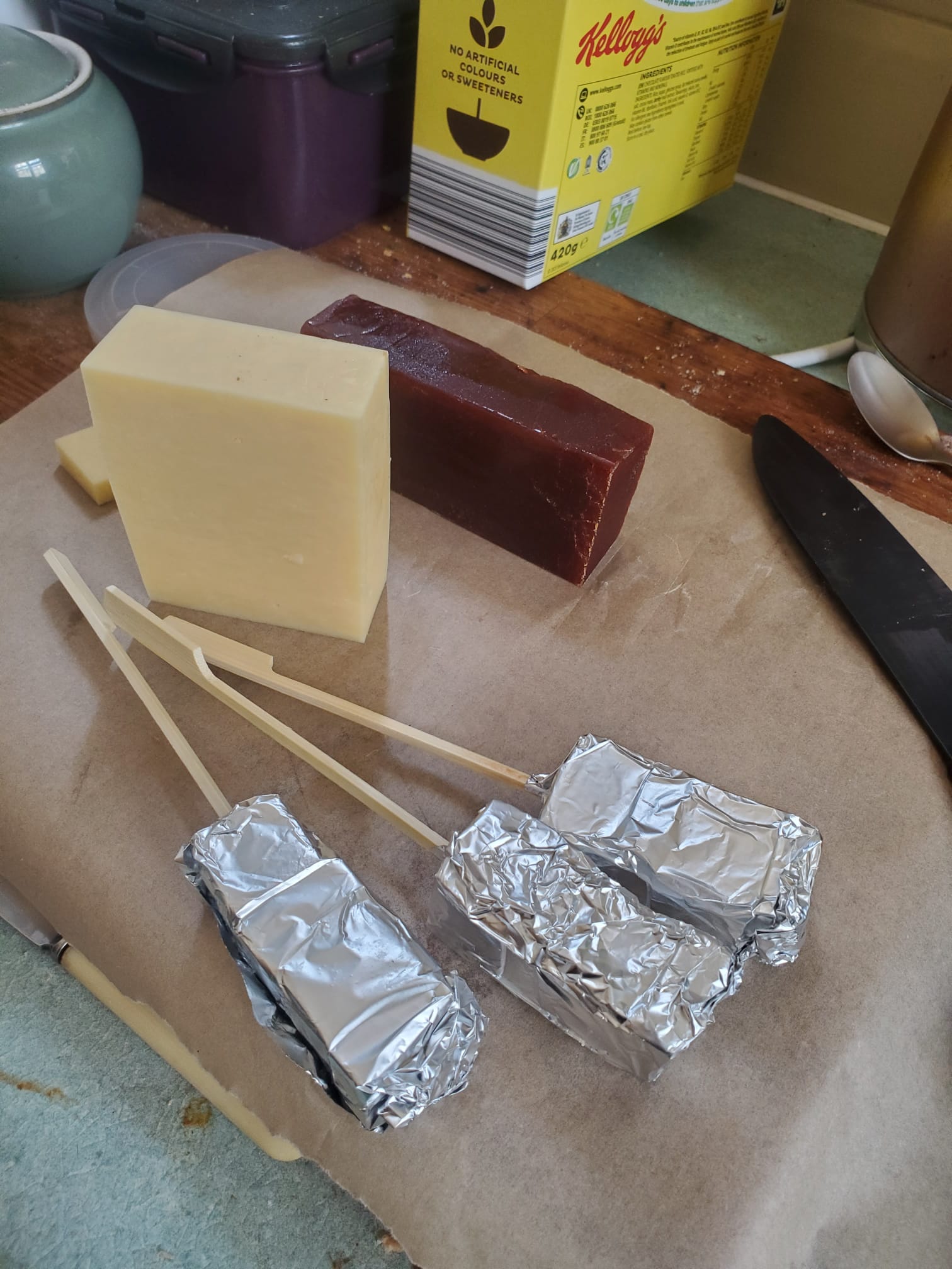 Made guava paste & cheese kebabs. They worked, although the foil wrapper was a pain to get off cleanly. Might go back to greaseproof paper next time or simply put them in individual sandwich bags. Perhaps Apidura make a handlebar mounted half-grapefruit to stick them in?