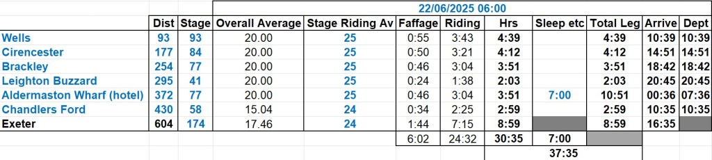 I’ve planned a schedule which should see me get to the hotel with plenty of time to sleep. The schedule errs on the side of caution – it’s slower than Back to the Smoke, but I’d rather be cautious and pleasantly surprised than overly optimistic and disappointed. It uses the standard allowance of 1hr faffage per 100km, which is very generous and usually results in additional time in hand. It gives me plenty of additional time for the last 230k and assuming I finish according to schedule, I’ll have nearly five hours in hand.