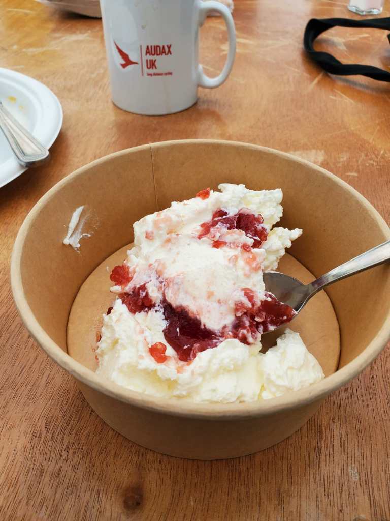 The mechanic had a reassuringly large and bushy beard, so we left Andy’s bike with him and went in search of chicken curry and more crumble. I did my good deed for the day and bought some cans of Coke for a Korean(?) rider who was helplessly waving a £20 note around while the controllers tried to explain payment was card only. He kindly donated one can back to me, which I managed to stash in a fridge to chill while we ate our food. Best crumble of the ride btw.