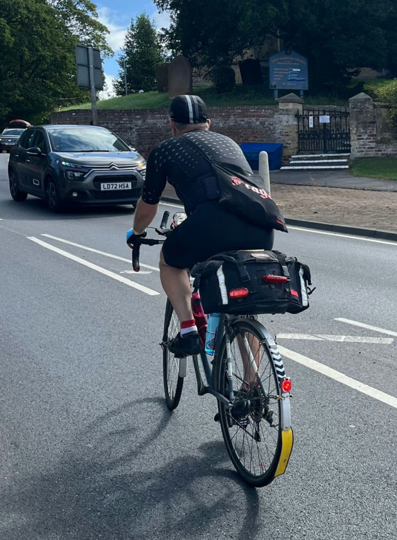 The observant will notice two large bottles on Achilles and wonder ‘what about the hydration pack?’ On a test ride, just a week before LEL, I happened to be using a new water bottle, a freebie from a work thing. It had a big hole at the top, rather than the usual sucky-nipple arrangement. OMG, it was so nice to just tip a drink into my face. So I bought two of the largest bottles I could find with similar tops and ditched the backpack. Bottles are less fiddly to fill than hydration bladders and with the big hole I was drinking plenty.